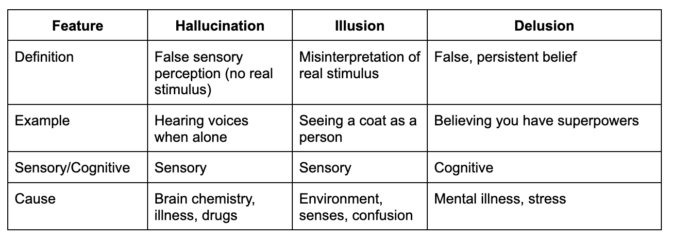 - They’re not illusions (which are misinterpretations of real stimuli) or delusions (which are persistent, false beliefs).